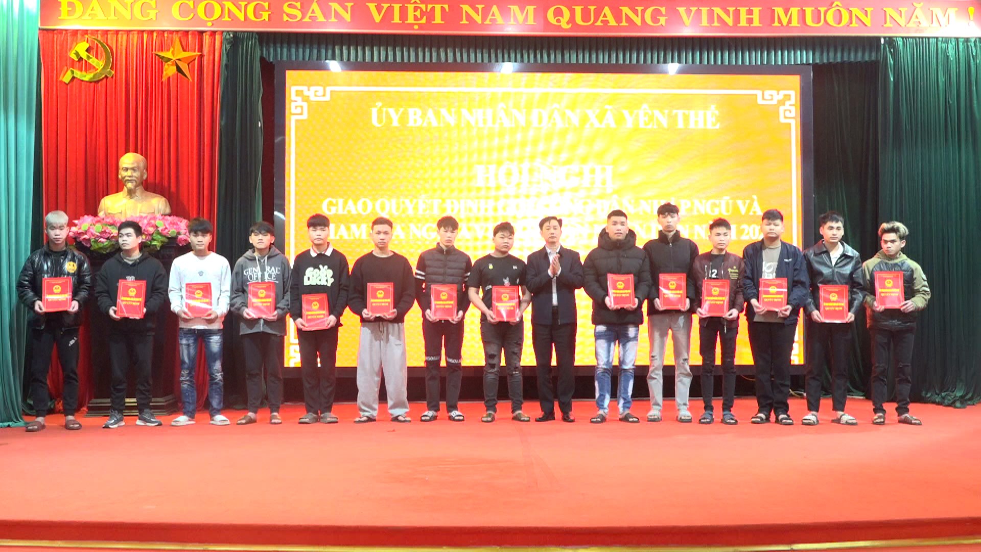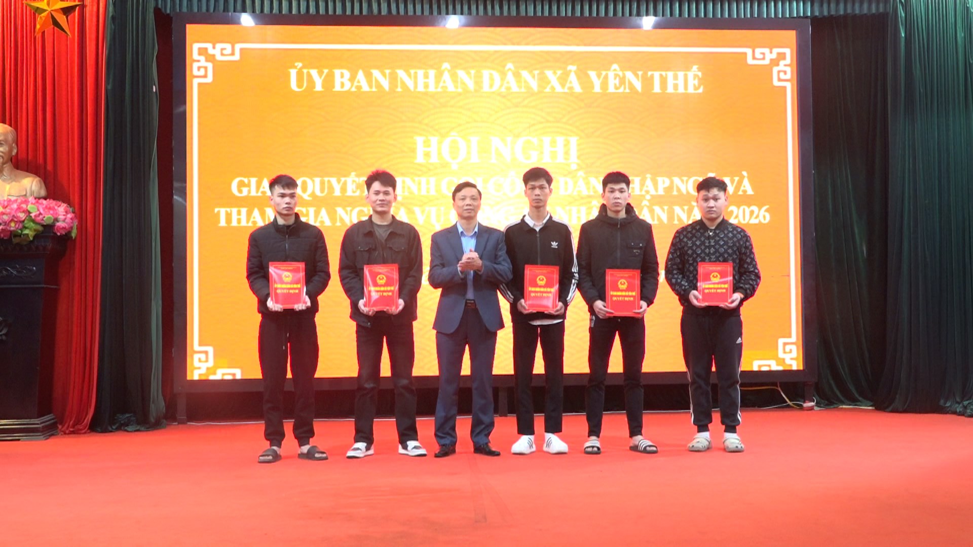 Sáng ngày 13/2, UBND xã Yên Thế đã tổ chức Hội nghị giao quyết định gọi công dân nhập ngũ và thực hiện nghĩa vụ tham gia Công an nhân dân năm 2026. Dự hội nghị có đồng chí Thân Hải Nam - Bí thư Đảng ủy, Chủ tịch HĐND xã; đồng chí Nguyễn Tiến Hà - Phó Bí thư Thường trực Đảng ủy xã; đồng chí Phan Tùng Dương - Phó Bí thư, Chủ tịch UBND xã, Chủ tịch Hội đồng nghĩa vụ quân sự xã; đồng chí Nguyễn Đức Thanh - Phó Chủ tịch HĐND xã.