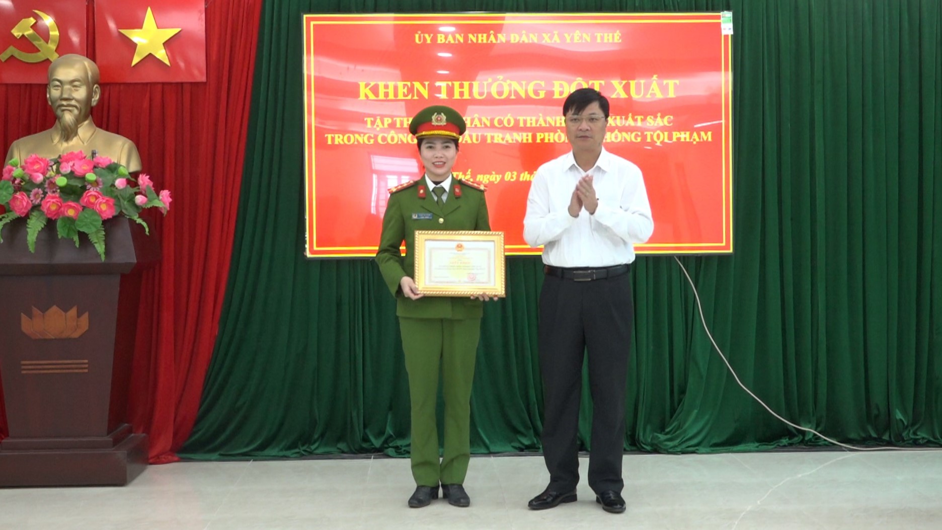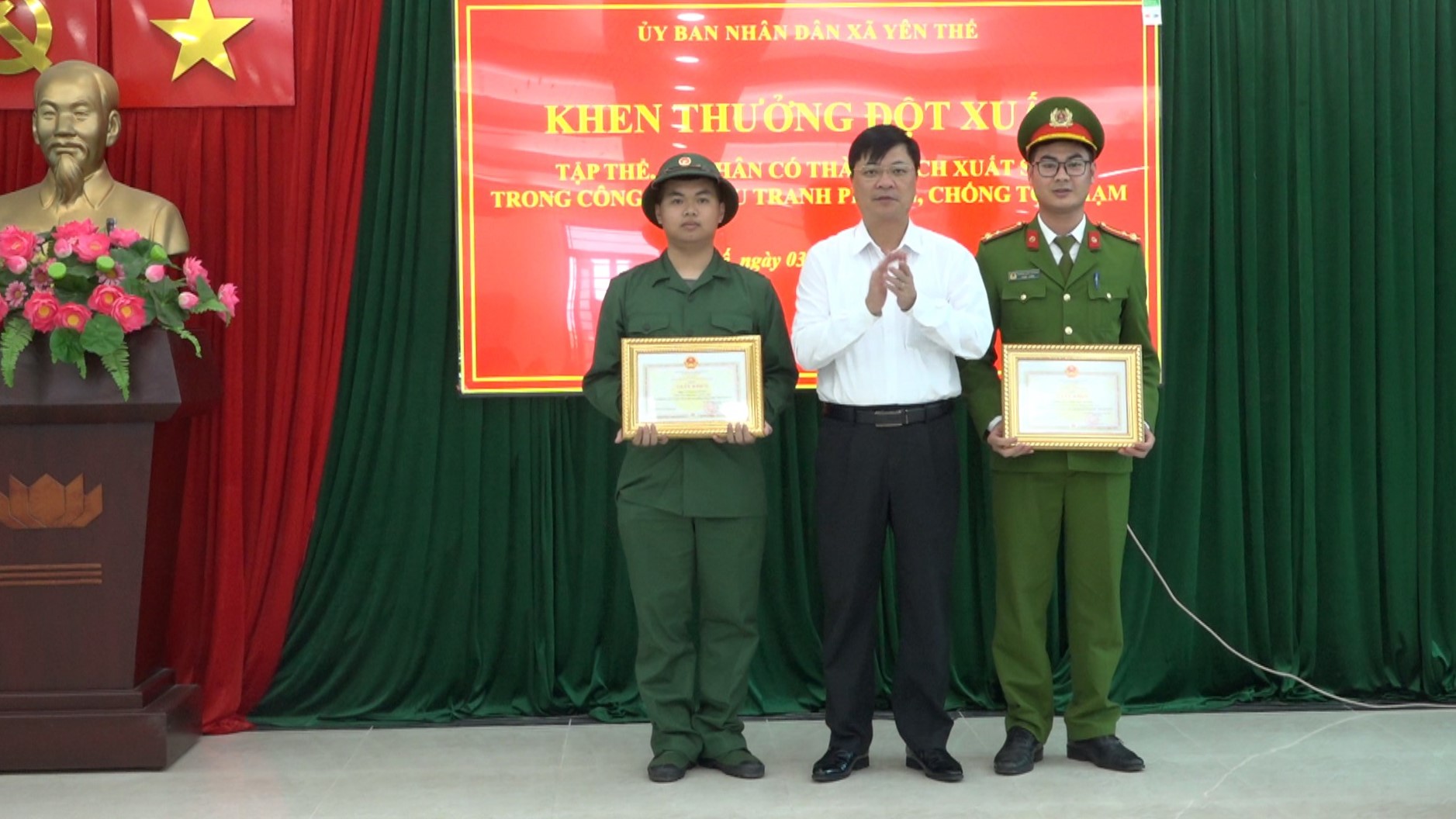 Để ghi nhận thành tích xuất sắc đó, ngày 02/3/2026, Chủ tịch UBND xã Yên Thế đã ban hành Quyết định số 407 về việc khen thưởng đột xuất cho Tổ Cảnh sát phòng, chống tội phạm - Công an xã Yên Thế và 02 cá nhân gồm: đồng chí Thượng úy Vương Đức Dương - Cán bộ Tổ CSPCTP và anh Vũ Tuấn Quyết - Công dân thôn Phan, tân binh sẽ lên đường nhập ngũ trong ngày 04/3/ 2026.
