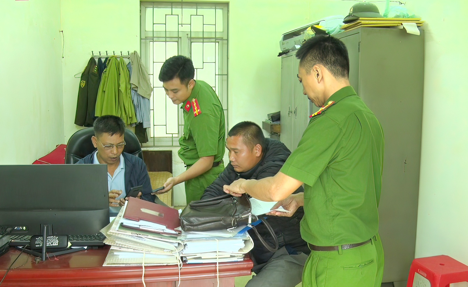 Đối tượng D.V.T (Thứ 2 từ trái sang) làm việc tại cơ quan chức năng